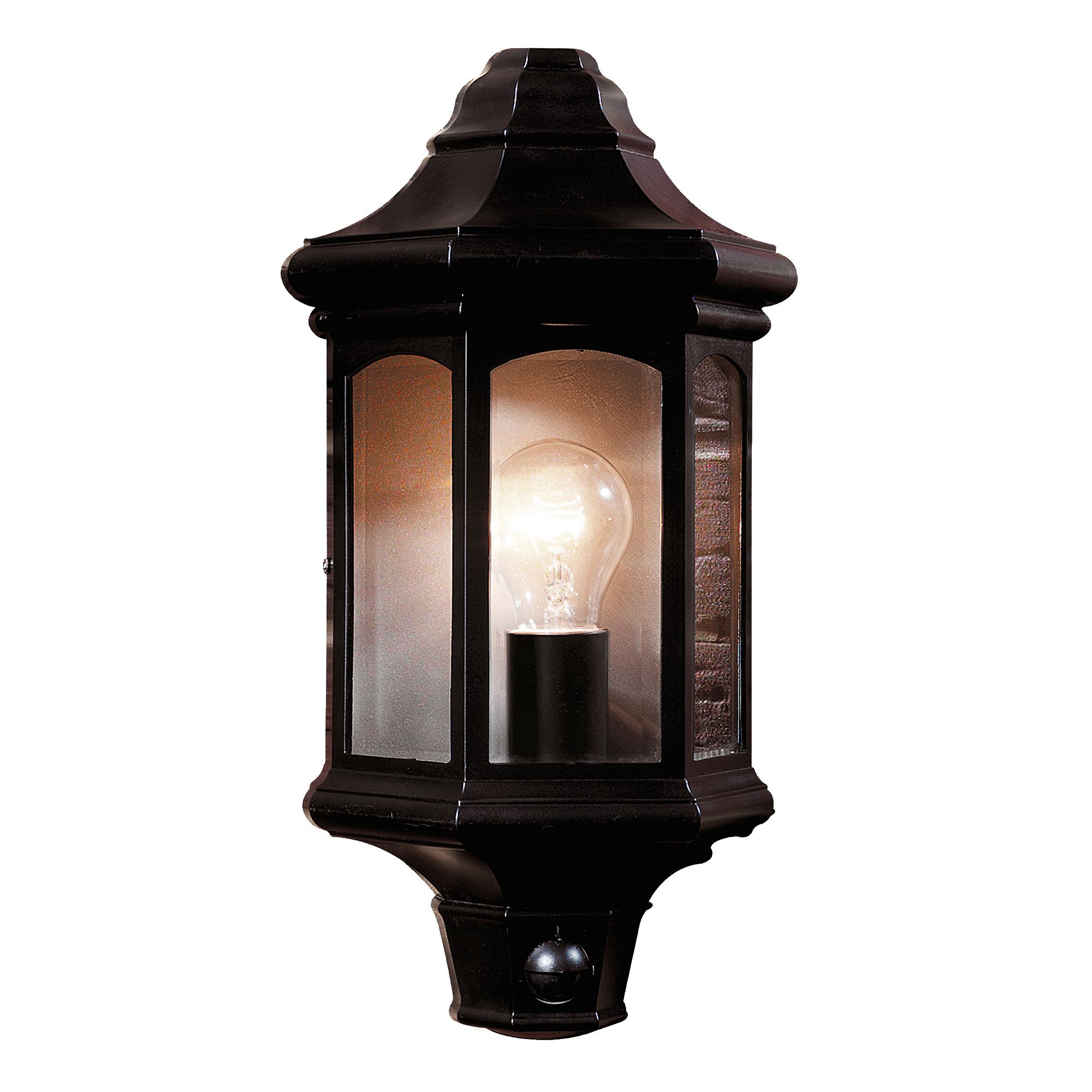 Traditional-style black wall lantern constructed from durable die-cast aluminium with motion-detection activation. Passive infra-red ( PIR ) sensor has a 5m range. Black Lantern PIR Security Detecting Sensor Flood Light. Self contained water-proof unit. PIR detectors are also very sensitive so just keep in mind where you position the light, as something as small as a bird or cat can activate the motion sensor.